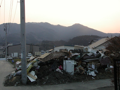 | Garbage plile across from the Ofunato Bible Baptist Church, March 2011. Junk from flooded houses. |